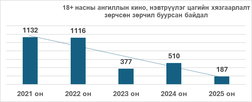 - Өдрийн цагаар 18+ тэмдэглэгээтэй контент нэвтрүүлсэн зөрчлүүд;